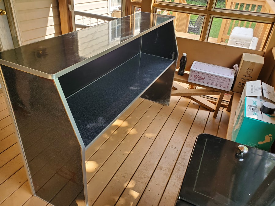 Our 72" portable folding bar service area prevents blockage of prep area by keeping condiment caddies within easy reach. Bar counter-top depth is 16" with plenty of room for napkins, straws, etc. The shelf depth is 17" with plenty of room for bottles, glasses & a cutting board. We do recommend that large stores of ice go underneath the bottom shelf, in a suitable container. TRANSPORTATION - The top of the bar can be easily removed, and the middle shelf and sides fold into mere inches for easy transport and storage to just about anywhere. ** The front of the bar is customizable for a sign names, Bride and Groom, etc. or just hang a banner. (No Staples, we either use safe surface tape, or low tack vinyl.) Fee’s will vary upon specific needs