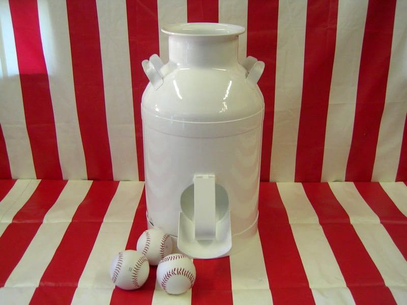 ~ Player stands a few feet away from milk can. With a player having three softballs to toss, odds of winning can be altered with our optional skill spacer for the top.