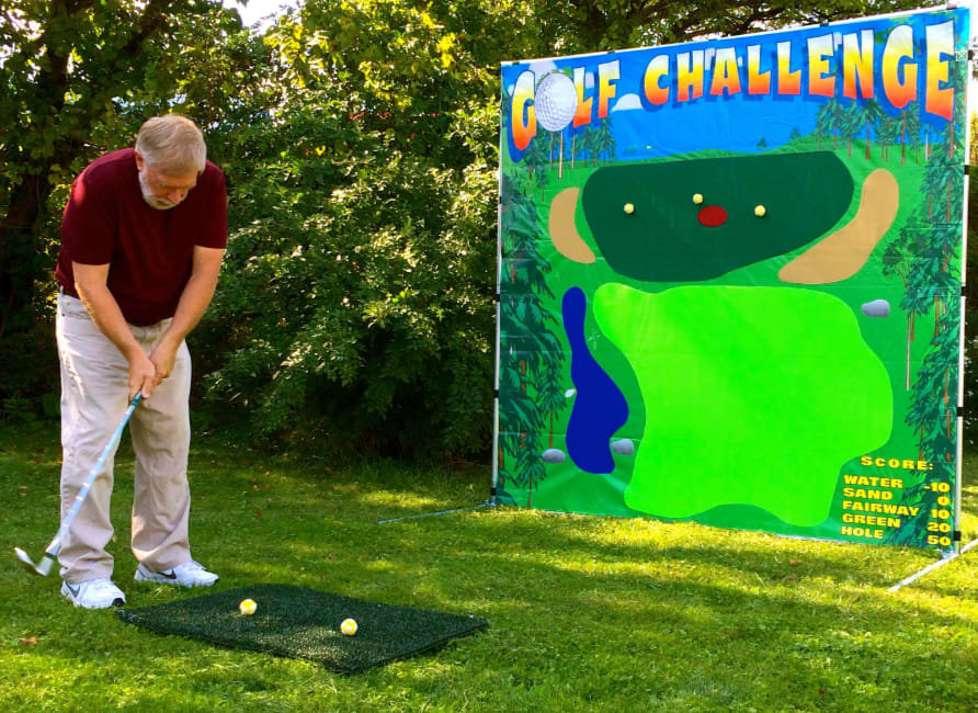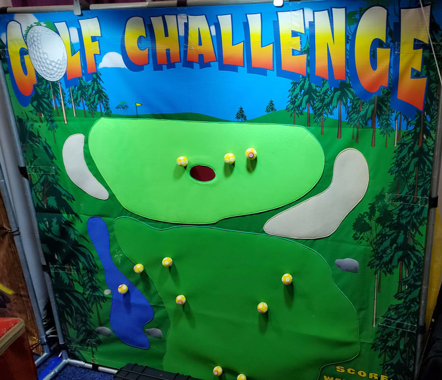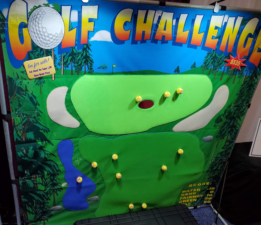 Golf Challenge 6' x 6' frame game comes with its own framework and heavy-duty vinyl canvas. The colorful backdrop, which is designed to look like a golf course, is Velcro-receptive, so the special Velcro practice golf balls stay right where you hit them. For pros or novices alike, this game can quickly become addictive. This compact, low-maintenance, low-cost unit will really boost your profit potential. Like all of our games, Golf Challenge can be set up in less than five minutes and can be used indoors or out.