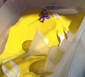 The wonderful colors of sand are easily seen through the variety of clear bottles. Watch as the children turn their bottle into their own sand art creation.