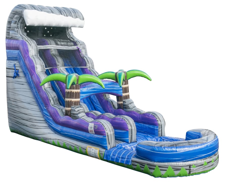 The 18' Tropical Tsunami Splash Slide features an attached pool with safety netting at the top landing area. This unit works with a standard garden hose, our soaker hose, & your water system.